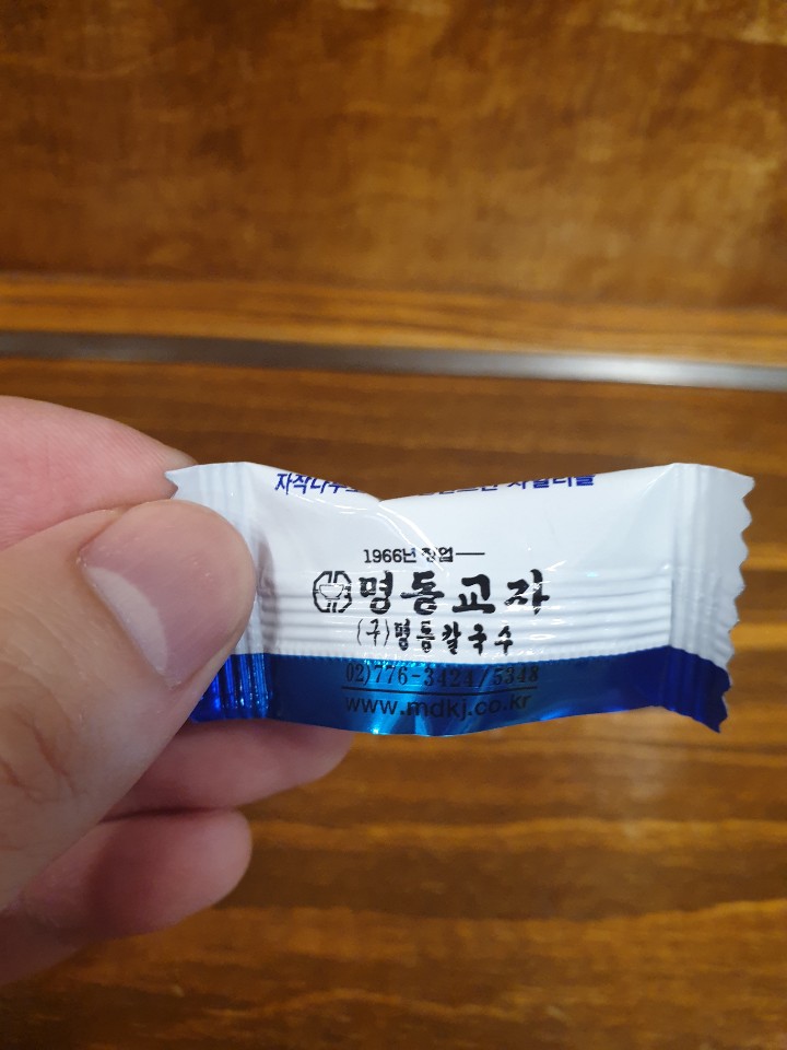 명동교자 문구가 새겨진 사탕입니다. 자체 제작한 사탕인 것 같습니다. 달달하게 입을 마무리 할 수 있어서 좋았습니다. 경영자의 센스가 돋보이는 전략이였습니다.