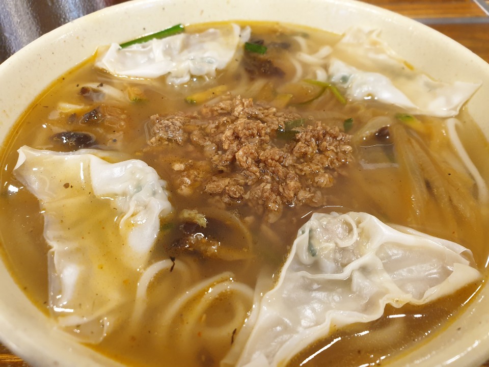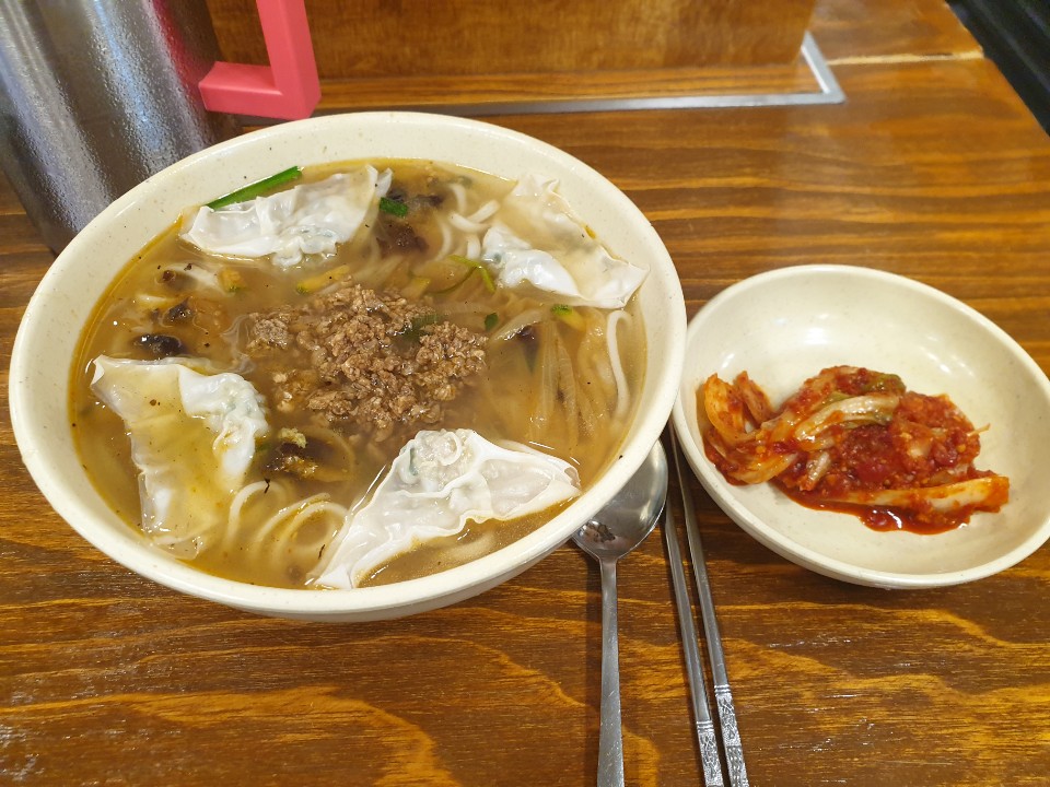교자 4개와 소복히 쌓인 소고기 고명 그 사이의 탱글한 국수가 보이네요. 고추가루를 아낌없이 넣어서 적절히 익은 김치가 같이 나옵니다.