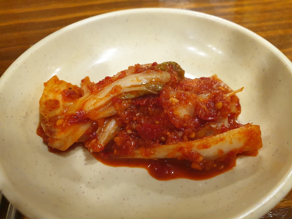 저 가운데에 큼지막한 다진 고추가 보이시나요? 제가 밖에서 먹은 김치중에 가장 매웠습니다. 매운 것도 천천히 올라오는 것이 아니라 입에 넣자마자 콱하고 들어오는 매운맛이였습니다. 왜 이렇게 맵게 만들었는지 모르겠습니다. 지금 글을 쓰면서 사진을 보고만 있는데도 땀이 나네요. 얼마나 매운지 감이 오시죠? 각오를 단단히 하고 먹기를 바랍니다.